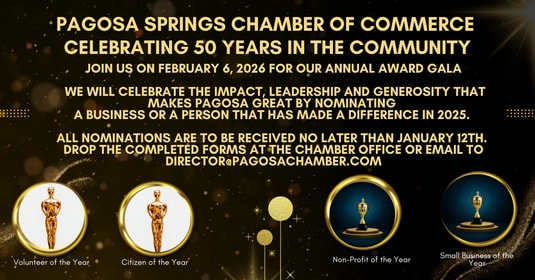 It is the vision of the Pagosa Springs Area Chamber of Commerce to facilitate our community’s transition and growth needs, creating a prosperous future in a business friendly, home town atmosphere.